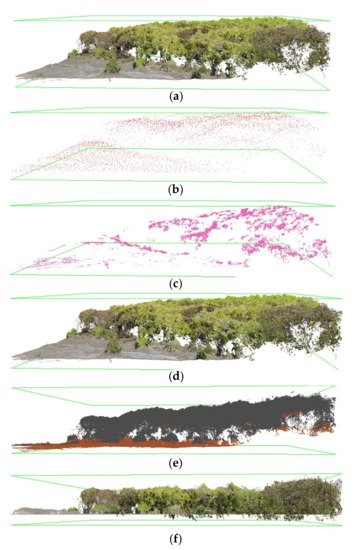 Point clouds processing: (a) raw point clouds, (b) the thinned 20% elevation percentile points, (c) high noise-classified points, (d) cleaned photogrammetry point clouds, (e) ground points classification (brown colour represents ground points and grey represents non-ground), (f) height normalisation.