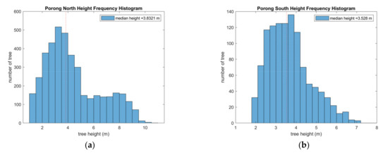 The detected mangrove trees height frequency histogram of (a) the north delta and (b) the south delta.