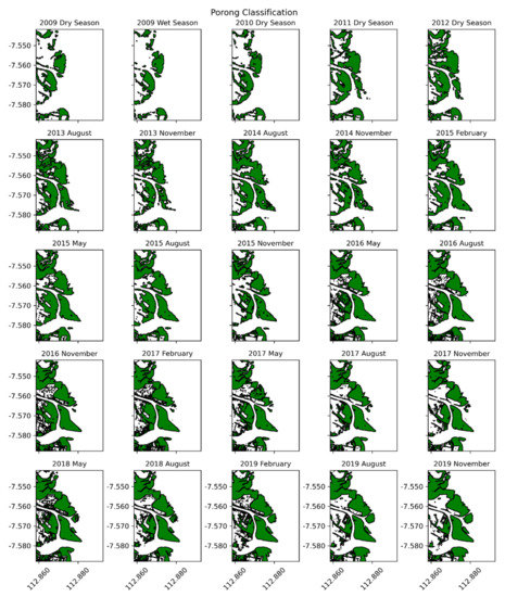Figure 10 and Figure 11 illustrate the development of the mangrove extent from 2009 to 2019. Figure 11 presents the result of the mangrove classification based on L7 (2009 Dry season–2012 Wet season), L8 (August 2013–August 2015), and the combination of S1–S2 (November 2015–November 2019). It can be observed that the mangrove belt expansion has strongly developed in the Porong River mouth. The mangroves on LUSI Island are clearly visible and have continuously expanded after the construction in 2011 (Figure 11). On the northern delta lobe, mangroves appeared in 2016 followed by the southern delta lobe in 2018. The land conversion to fish ponds in the hinterland is apparent as well in the figures.