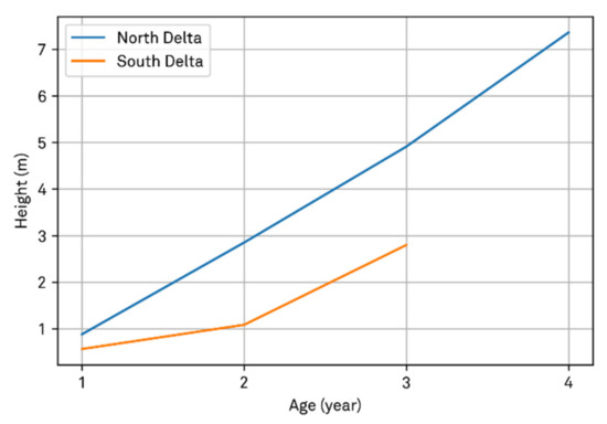 By taking advantage of the age map and the high-resolution CHM, a relationship of mangrove height dependent on stand age was setup for the two Porong delta lobes. A mean height distribution across the mangrove age map was calculated by clipping the mangroves’ age polygon to a CHM raster. Figure 14 compares the age-height relationships from the delta lobes’ mangroves. The northern delta mangroves were consistently taller than the southern ones at the same stand age. By only taking the mangrove trees into account that were taller than 1.3 m, the average annual mangrove growth of the northern delta amounted to 2.26 m yr−1. In contrast, the mangroves in the southern delta had an annual mangrove growth rate of 1.71 m yr−1.