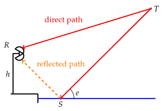 Typical GNSS-R geometry with the local elevation angle e and the receiver height h.