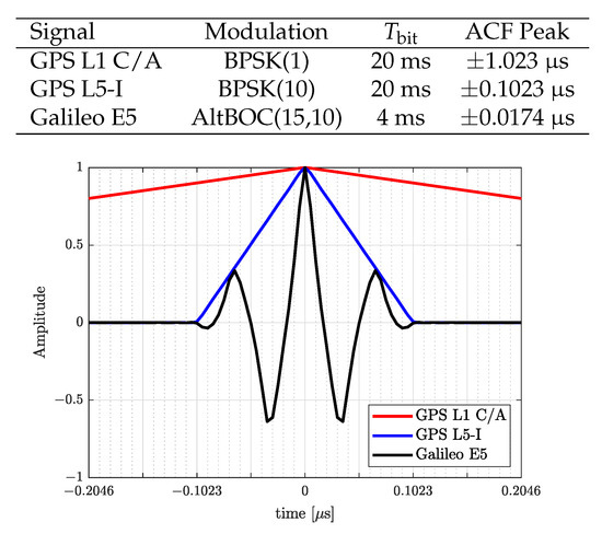 (Top) Representative GPS and Galileo signals’ characteristics. ACF peak refers to the first zero-crossing of the ACF. (Bottom) GPS L1 C/A, GPS L5-I, and Galileo E5 ACFs.