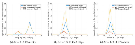 Squared modulus of the correlation functions for an L1 C/A signal in the case of crosstalk. In these figures, both signals are in phase (), and the amplitude of the LOS crosstalk signal is half of the reflected signal ().