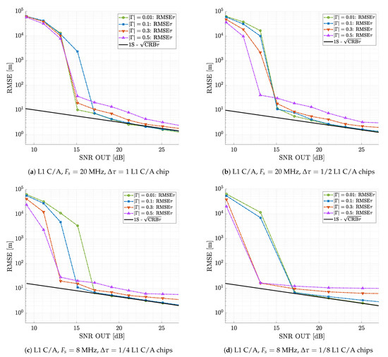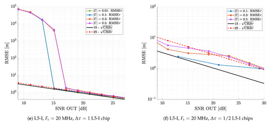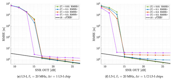 From the GPS L1 C/A results, we can draw three main conclusions: (i) In a dual source context, the single source estimators only converge to the bound for very low values of (i.e., 0.01 and 0.1 in the L1 C/A chips results or only 0.01 in the case of L1 C/A chips);. In this case, there is no impact of a possible crosstalk. (ii) For higher values of , the 1S-CMLE never converges to the 1S-CRB, and therefore, the crosstalk induces a performance degradation. This significantly impacts the receiver performance for and for L1 C/A chips. It is worth pointing out that in such conditions, the estimator RMSE reaches a constant floor, which is typical of a biased estimator (easy to spot in Figure 5d–f). This is due to the fact that for a significant value of , the crosstalk distorts the CCF and shifts its maximum. Consequently, even if, for larger , the threshold seems to be earlier, the estimated value turns out to be biased. (iii) These results justify the need for dual source estimators or other robust solutions if a possible strong crosstalk is expected. For the GPS L5-I case, we can see the same behavior for L5-I chips and a performance saturation for L5-I chips (even for ). This is because the achievable RMSE with an L5-I signal is far below the corresponding one with the L1 C/A signal (i.e., the L5-I CCF is sharper than the L1 C/A CCF); therefore, small deviations on the CCF have a larger impact on the final performance.