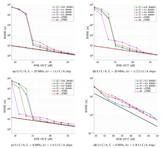 In the sequel, we show the root mean squared error (RMSE) results for the time-delay estimation of the stronger signal, being for instance the main parameter of interest for GNSS-R altimetry, with respect to the signal-to-noise ratio (SNR) at the output of the matched filter.