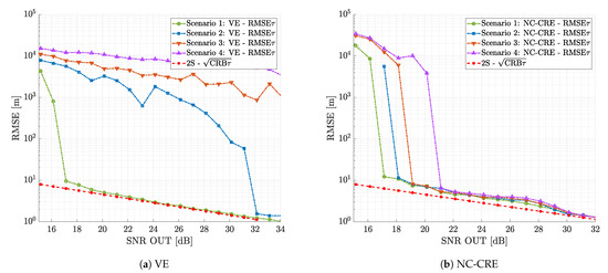 The RMSE results obtained for the four scenarios with both the VE and NC-CRE are shown in Figure 8. First, notice that the VE performance for a fully non-coherent scenario (#1) reaches the corresponding dual source CRB (i.e., which is almost equivalent to the single source CRB in these scenarios; refer to the middle-left plot of Figure 6) at around 17 dB; then, in this case the estimator is asymptotically efficient and behaves similar to the 1S-CMLE without crosstalk. In contrast, when the coherent part of the reflected signal increases, its performance drastically degrades, and the VE is not a valid approach anymore (i.e., Scenarios #3 and #4), as expected by construction. Therefore, the VE is only useful if considering reflected signals with a dominant non-coherent component such as ocean surfaces, but it is not for specular reflections over ice or for certain land surfaces with a significant coherent signal part. Regarding the NC-CRE, it is asymptotically efficient irrespective of the signal coherency, therefore being a very powerful seamless alternative to the VE. Notice that the NC-CRE for the estimation of the reflected delay does not fully converge to the corresponding 2S-CRB until the convergence of the estimation of the secondary delay (in this case, the LOS delay), at 30 dB, but the performance degradation between the first threshold and 30 dB is minor. Then, both methods have their pros and cons, the VE being easier to implement and the NC-CRE being more robust to the type of surface.