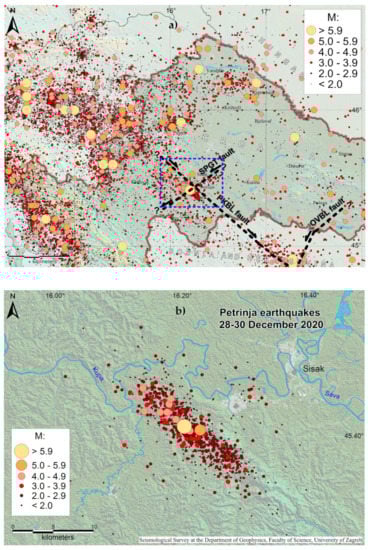 (a) The spatial distribution of earthquakes in Croatia (373 BC–2019, according to the Croatian Earthquake Catalogue (CEC), of which an updated version was first described in [], with the Pokupsko-Petrinja epicentral area indicated (blue rectangle). Thick, black-dashed lines mark regional active faults: PKBL=Pokuplje-Kostajnica-Banja Luka right-lateral fault, SPGT=Sisak-Petrinja-Glina-Topusko left-lateral fault and OVBL=Orljava-Vrbas-Banja Luka left-lateral fault; and (b) Pokupsko-Petrinja epicentral area with the distribution of the epicentres of the 28 to 30 December 2020 seismic sequence.