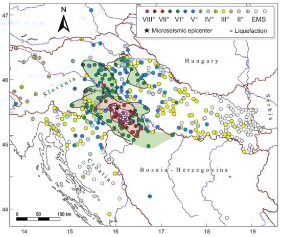 Isoseismal map of the Kupa Valley earthquake on 8 October 1909—macroseismic intensities were assessed according to the European Macroseismic Scale (EMS) [].