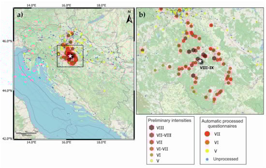 (a) A preliminary intensity map for the M6.2 Petrinja 2020 earthquake, which was obtained by automatic processing of questionnaires (circles) and by a macroseismic field survey (preliminary values, which are marked by hexagonal shapes); and (b) Intensities in the wider Petrinja area, which is indicated by a rectangle in (a) [].