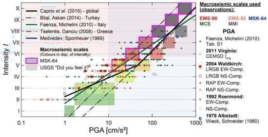 Example of a comparison of the peak ground acceleration (PGA) measurements for the 1978 Albstadt, 1992 Roermond, 2004 Waldkirch and 2011 Virginia earthquakes and the database of Faenza and Michelini in 2010 [].