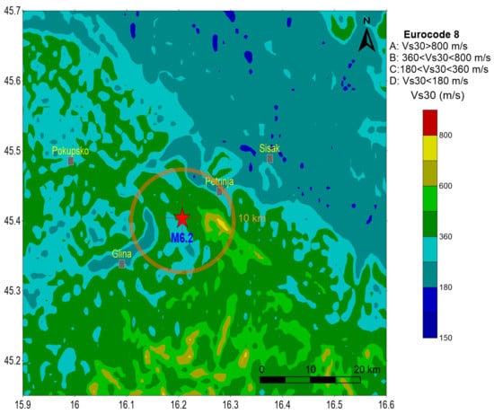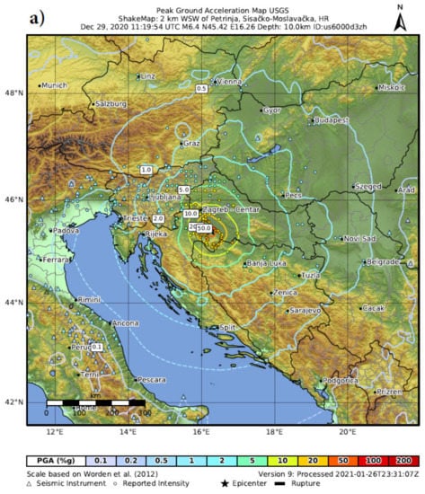 The M6.2 earthquake, which hit the area around Petrinja on 29 December 2020, was felt throughout Croatia and in the surrounding countries, with the highest intensity estimated as VIII-IX °EMS scale. A preliminary intensity map is shown in Figure 3 [].