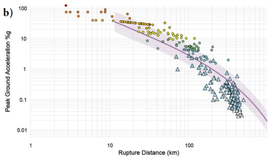 USGS Shake Map analysis: (a) The peak ground acceleration map and (b) GMPE peak ground acceleration predictions (thick purple line) and observations (seismic stations—blue triangles, Did You Feel It DYFI—coloured circles) in consideration of local site effects [].