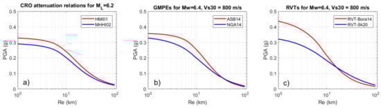 Estimation of the distance scaling PGA for rock (VS30 = 800 m/s) based on (a) available Croatian attenuation relations HMI02 and MHHI02, (b) GMPEs from ASB14 that were derived for Pan-European sites and NGA14 (NGA West-2 GMPEs) from BSSA14 and CY14 (with weights of 0.5 for each), and (c) Random Vibration Theory models that were derived by Bora14 for the RESORCE-2012 database and RVT-Sk20 for the BSHAP database.