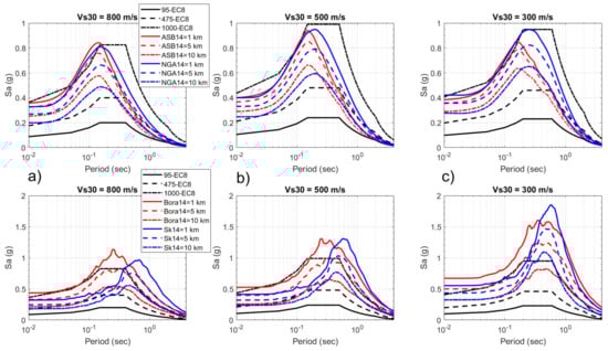 Destructive earthquakes that occurred in the last three decades (Nepal, 2015; Christchurch, 2011; Chile, 2010; Sichuan, 2008; Kocaeli, 1999; Kobe, 1995; Northridge, 1994; Loma Prieta, 1989; Mexico City, 1985) proved that the effect of local soil conditions on the earthquake damage distribution was substantial compared to travel path effects and the effects that were induced by the proximity of earthquake sources. The site amplification factor can be estimated using predefined linear and nonlinear site amplification components that have been utilized in ground motion models (GMPEs) for shallow crustal and active tectonic regions (e.g., global NGA-West 1 and West 2 GMPEs, RESORCE models) as functions of the reference rock PGArock and site VS30. These models are included in the ASB14, BSSA14 and CY14 models. Bora14 did not include nonlinear amplification and neither did the Sk20 model; hence, their models showed only linear amplification with ln(VS30) in their formulations. Based on the available VS30 map [] that was derived on a topographic slope ([], Figure 14), close and wider epicentral areas varied between two site categories, namely B (360–800 m/s) and C (180–360 m/s), based on the Eurocode 8 categories. Both Croatian attenuation relations, HMI01 and MHHI02, only derive reference rock PGA values. In Figure 15, we compare EC8-Type 1 (the importance factor is 1.0 for ordinary buildings) response spectra for 95, 475 and 1000 year return periods with ASB14 and NGA14 response spectra (5% of the critical damping) and with RVT response spectra from Bora14 and Sk20 for three site categories, namely C (300 m/s), B (500 m/s) and A (800 m/s), at close distances of 1 km, 5 km and 10 km from the epicentre.