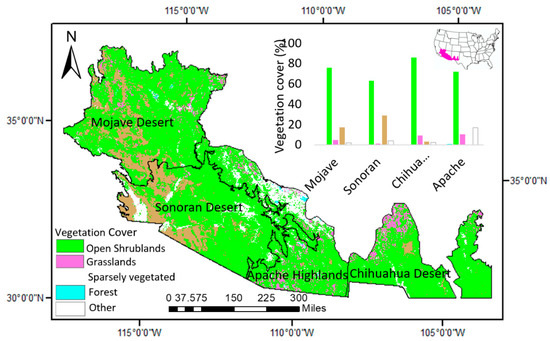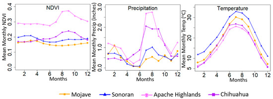 Khatri-Chhetri, P.; Hendryx, S.M.; Hartfield, K.A.; Crimmins, M.A.; Leeuwen, W.J.D.v.; Kane, V.R. Assessing Vegetation Response to Multi-Scalar Drought across the Mojave, Sonoran, Chihuahuan Deserts and Apache Highlands in the Southwest United States. Remote Sens. 2021, 13, 1103. https://doi.org/10.3390/rs13061103