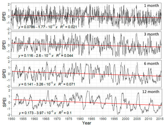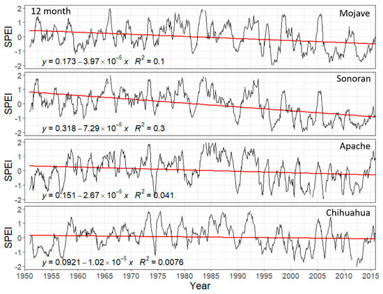 | 12 month—SPEI | Mojave | −3.97 × 10−5 | 0.102 |