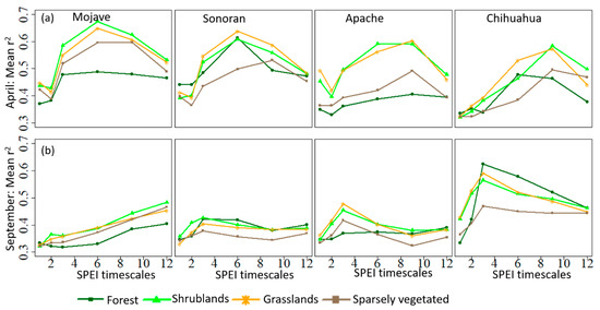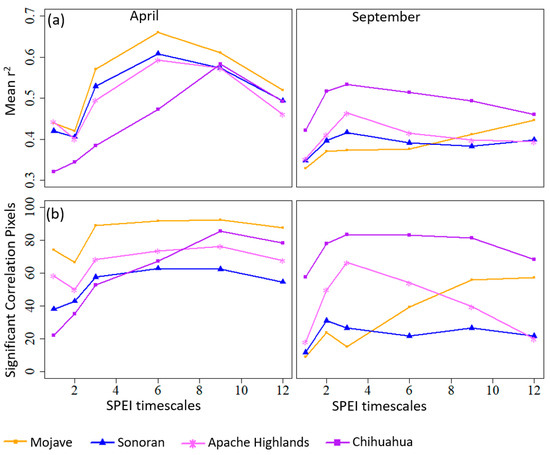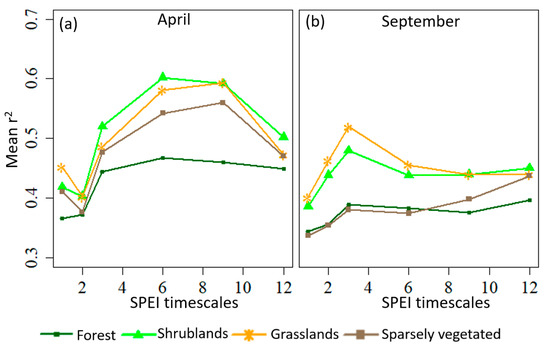 3.2.1. April NDVI Response to Different SPEI Timescales