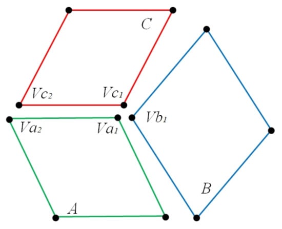 Graphic illustration of the two types of topological relations. In polygons A, B, and C, if edge (Va1, Va2) matches edge (Vc1, Vc2), then the polygon pair (A, C) is considered to be pairwise adjacent. If vertices Va1, Vb1, and Vc1 are matched with each other, then polygon triplet (A, B, C) is considered to intersect at the common point of the three supporting planes.