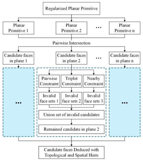 The overall workflow of this process is shown in Figure 4. The planar primitives are first pairwise intersected with each other within the scope of the enlarged bounding box to form over-redundant candidate faces. Then, the candidate faces in each plane are processed separately to eliminate part of them according to the detected topological relations in the previous steps and the spatial hints. After that, the union set of invalid candidates are removed. Finally, the remaining candidates in all planes are merged and those that do not satisfy the two-manifold rules are treated as outliers.