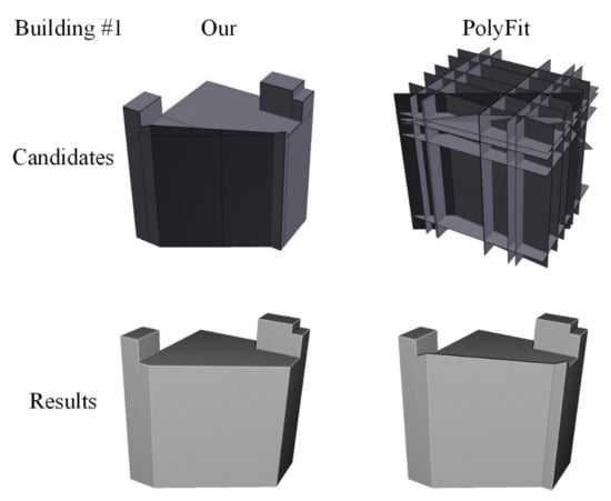 Comparison of candidate faces and resulting models generated by the proposed method and PolyFit [] for Building #1.
