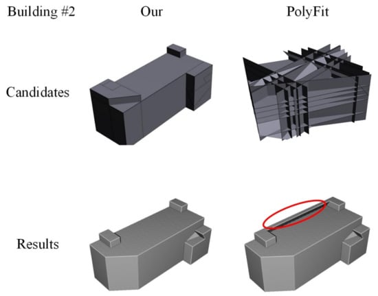 Comparison of candidate faces and resulting models generated by the proposed method and PolyFit [] for Building #2.