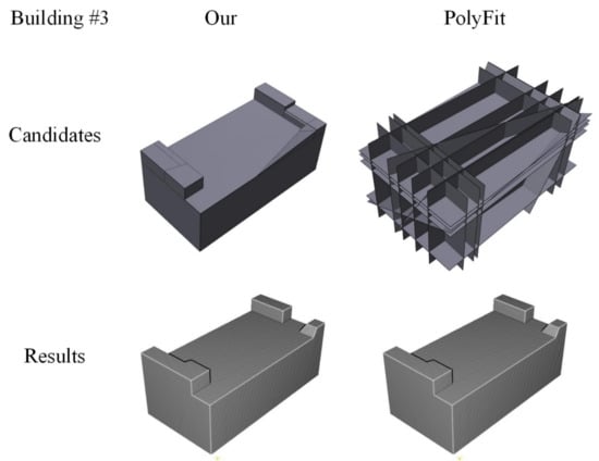 Comparison of candidate faces and resulting models generated by the proposed method and PolyFit [] for Building #3.