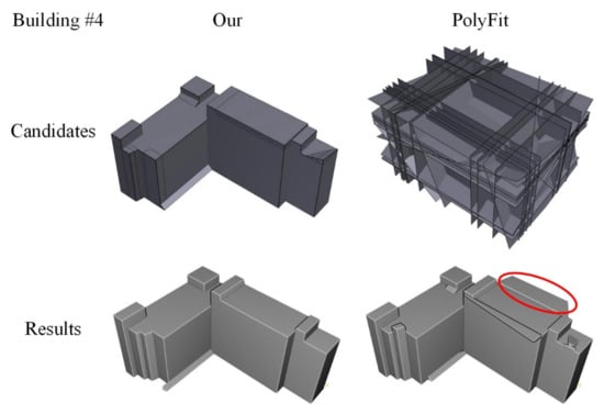 Comparison of candidate faces and resulting models generated by the proposed method and PolyFit [] for Building #4.