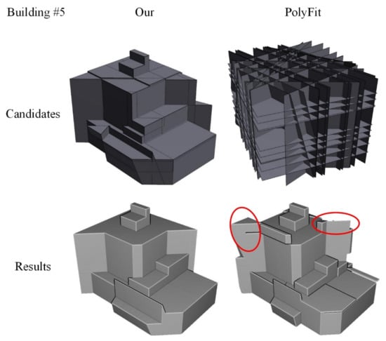 Comparison of candidate faces and resulting models generated by the proposed method and PolyFit [] for Building #5.