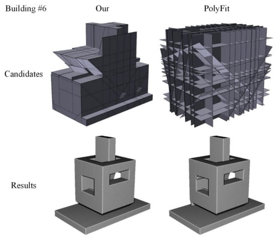 Comparison of candidate faces and resulting models generated by the proposed method and PolyFit [] for Building #6.