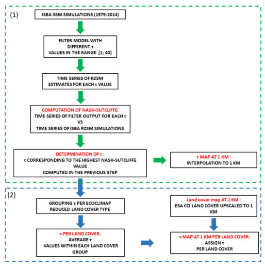 As a first step, the ISBA surface soil moisture simulations spanning 1979–2014 are used as an input to the filter model, with different parameter values in the range [1; 40]. Since the output of the filter is a measure of the water index rather than the volumetric water content, the ISBA simulations were scaled between [0; 1] prior to using them as input. Root-zone soil moisture estimates are hence obtained for all parameter values considered. These estimates are then compared with the ISBA RZSM simulations, and the value corresponding to the highest Nash–Sutcliffe (NS) efficiency coefficient obtained is then chosen. The Nash–Sutcliffe efficiency was chosen to evaluate the prediction accuracy. It is defined as one minus the ratio of the error variance of the estimated time series, divided by the variance of the observed time series. NS is equal to 1 in the case of a perfect match between estimations and observations. A value of 0 implies that the estimation error variance is equal to the variance of the observations, while a negative value implies that the estimation error variance is significantly larger than the observation variance. Therefore, values of NS closer to 1 suggest a model with more predictive skill. As the ISBA resolution is 5 km, a table of calibrated values was obtained at this resolution. For validation purposes at 1 km resolution, these values were later interpolated to 1 km using a linear interpolation.