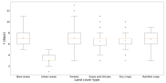 The following values (and corresponding standard deviation) were obtained according to the six land cover types considered: 3.08 (1.13) for urban areas, 6.48 (1.36) for grass and shrubs, 6.64 (1.26) for rainfed crops, 6.89 (1.14) for irrigated crops, 7.08 (1.44) for bare areas and 7.09 (1.77) for forests. Figure 4 presents boxplots of the values. For the application of the filter over the study area, only rounded values (i.e., in terms of days) of the parameter have been considered, i.e.: 3 (urban areas), 6 (grass and shrubs), 7 (rainfed crops, irrigated crops, bare areas and forests).