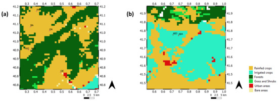 1 km resolution ESA CCI reduced land cover zoomed over the validation areas: (a) Terres de l’Ebre and (b) Algerri Balaguer. The location of the validation sites are represented by circles.