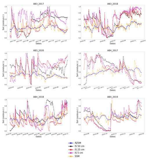 Time series of scaled in situ and SMAP-derived 1km resolution RZSM and SSM estimates. The images refer to data collected over the Algerri Balaguer region in the following order: AB3_2017, AB3_2018, AB3_2020, AB4_2017, AB4_2018, AB4_2019.
