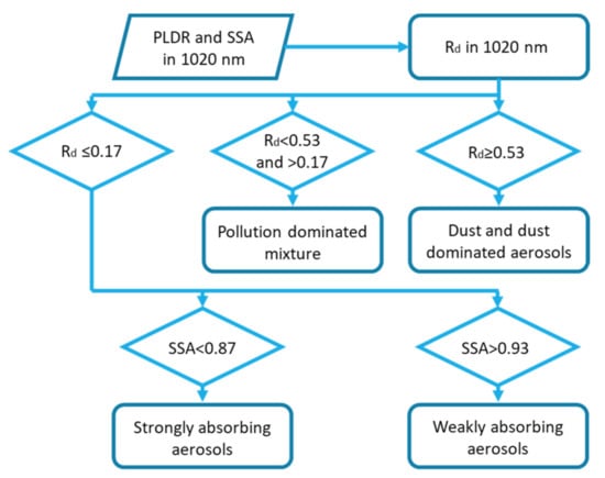 As shown by Figure 1 below, inspired by the threshold from Shin [], when the Rd is larger than or equal to 0.53, the aerosol mass will be classified as dust and dust dominated aerosols (DD). When the Rd is smaller than 0.53 but larger than 0.17, aerosol mass is regarded as pollution dominated mixture (PDM), which implies the dust plume coat with fine-mode aerosol and changes the shape of aerosol externally. Furthermore, for the Rd smaller than 0.17, SSA in 1020 nm will classify the rest of the aerosol mass into strongly absorbing aerosols (SA) or weakly absorbing aerosols (WA) when the SSA is smaller than 0.87 or larger than 0.93, respectively. Shin has investigated that the relationship between SSA and volume size distribution vary with respect to different intervals of PLDR as the feasibility analysis, which proposed that SSA combined with PLDR in 1020 nm can classify the aerosol effectively [].
