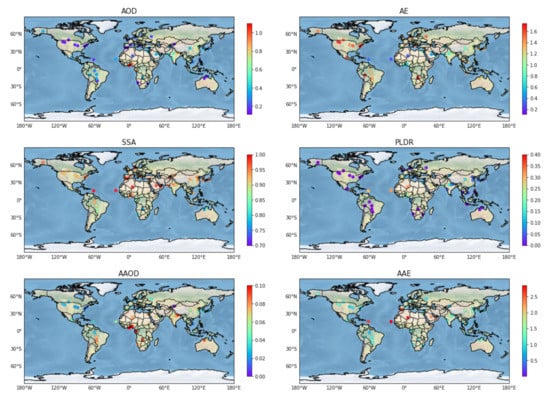 Scatter plots of AOD, AE, SSA, PLDR, AAOD, AAE distribution in the global range. The color dot in each station implies the mean values in the color bar.