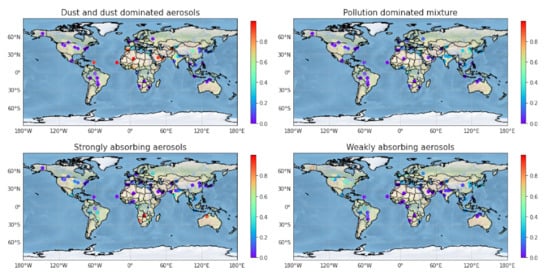 As shown in Figure 3, dust and dust dominated aerosols prevail in West Africa, southwest of Europe, Middle East, northwest of China and Pakistan. In detail, the occurrence frequency is 0.94 0.87, 0.93, 0.83, 0.87, 0.99, 1.00 for Guadeloupe, Mezaira, Solar village, Dushanbe, Granada, Cape Verde, Tamanrasset INM station, respectively. The spatial distribution of dust and dust dominated aerosols are also stretched to the Caribbean area by the high proportion in Guadeloupe station. The result is corresponding to a famous “dust belt”. As the major emission source of dust plume in the Northern Hemisphere [], the dust belt crosses over the eastern subtropical Atlantic to Arabian Peninsula region and with frequent dust plume resuspension. Furthermore, air quality in the south of Europe is mainly associated with dust long-distance transport from northern Africa, resulting in frequent occurrence of mineral dust and dust dominated aerosols in there (especially in Granada site located at the Iberian Peninsula) []. The result from observations also shows the spatial distribution of dust and dust dominated aerosols occurrence with a marked South-to-North gradient from the north of Africa to the south of Europe, and this phenomenon is linked to frequent African dust plumes [].