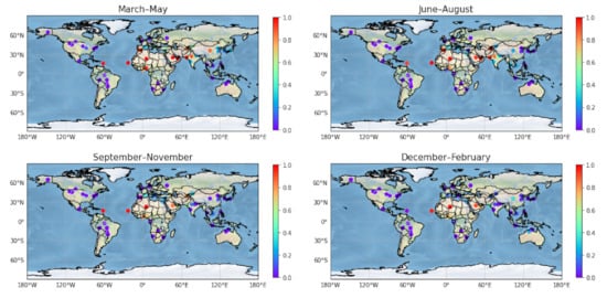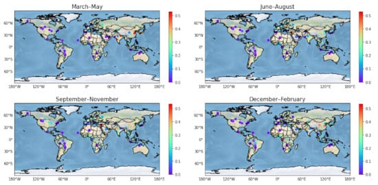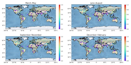 Weakly absorbing aerosols are usually emitted by anthropogenic activities, such as SO2 produced by industries, injected into the air and translated to sulfate by gas-to-particle conversion, strengthening the abilities about solar scattering and extinction of aerosol. As shown in Figure 7, the high proportion of weakly absorbing aerosols regions are mainly focused on North America, Europe, east of Asia and southern Africa. It is worth mentioning that there are no aerosol types in America from December to February because of a lack of valid data, the dominated rules of weakly absorbing aerosols in Rio Branco, CUIABA MIRANDA located at South America from December to May, Gobabeb station located at South Africa from December to February are less reliable because of small sample sizes.
