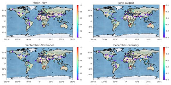 Lastly, Australia is also a main contributor to strongly absorbing aerosols emission source in the Southern Hemisphere. It ranks third in the amount of global total biomass burning emission. Australia takes up 8% of biomass burning emissions in the world, while Africa and South America contribute 48% and 27% of biomass burning to the total biomass burning emission, respectively []. Figure 6 reveals that there is a distinct seasonal cycle about the occurrence of strongly absorbing aerosols in the north of the Australia continent, a higher proportion (93.5% in Jabiru and 100% in Lake Argyle) of strongly absorbing aerosols appear from June to August, while a lower proportion appears in other months among two stations. The period from May to September coupled with large vegetated region by savanna forest and grassland in the tropical north, results in vegetation that is highly susceptible to fire [].