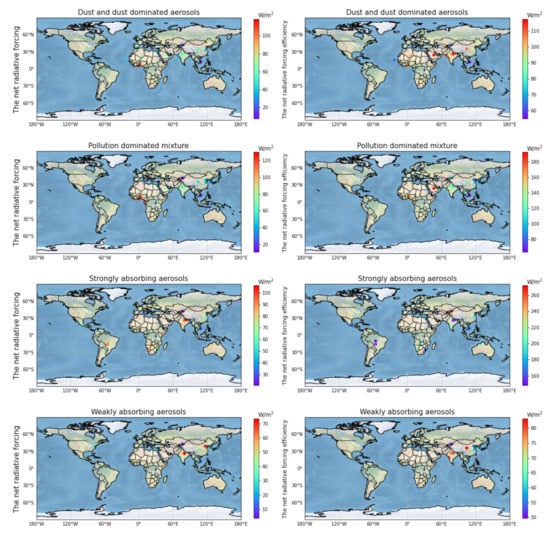 3.4. The Net Radiative Forcing and Radiative Forcing Efficiency for Each Kind of Aerosol