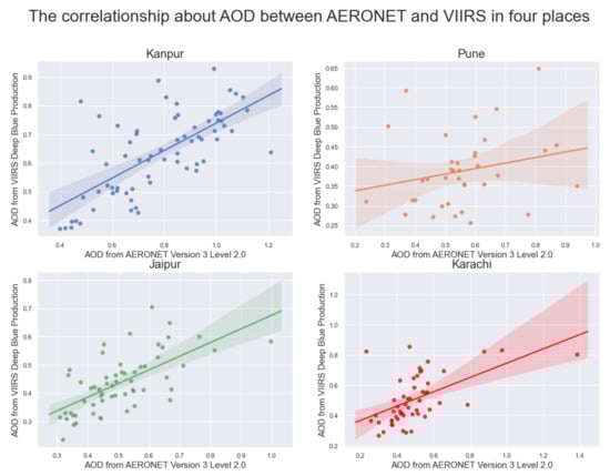 Regression plots about the AOD from AERONET Version 3 Level 2.0 dataset against AOD from VIIRS Deep Blue Production in four stations of India and Pakistan (different colored lines and points suggest data from different places).