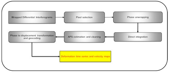 Figure 1, uses a stack of interferograms with a temporal baseline of the shortest period available, ideally 6 days, to easily retrieve a terrain deformation map over a set of PSs containing the information of the estimated annual velocity and the displacement time series. The interferogram generation involves the standard steps for the estimation of the differential interferogram and associated coherences. Thus, the input data consist of a set of N images and the corresponding N-1 interferograms calculated by using consecutive images. The DI approach has four main steps: