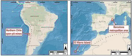 Figure 3, where the proposed methodologies are applied for the semi-automatic identification and pre-screening of the deformation processes. Firstly, we propose a successful case of application of the DI: a region located in the north of Chile, entailing two open pit mines. Secondly, we propose a less favorable case of DI but successful for PSIG-STB, the Hierro Island test site. Finally, we propose an example of Barcelona metropolitan area where the results of PSIG-STB have been used operatively to monitor different infrastructures.