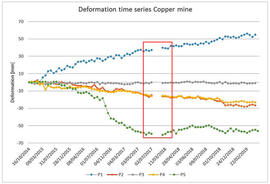 Figure 8. The displacements ranging from −60 cm/year to 20 cm/year are mainly due to settlements of mining wastes in the stacks and slope instabilities of the mining pits, similar to the previous example. Most of the deformation points showed liner or bilinear trends in the time series. These points also displayed brief periods of stability. The results, in this case, show the ability of the proposed approach to properly detect active areas. Moreover, the approach can be used as a tool for supporting in situ measurement by providing information about the area of influence of the phenomena.