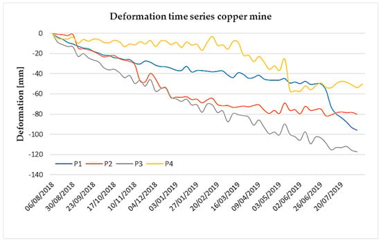Figure 6) of four selected points: one stable (P3) and three unstable (P1, P2, and P4). Movements towards the satellite are shown in blue (positive values), while movements away from the satellite are shown in red (negative values). In this case, the detected movements are caused by different mining activities. The displacements shown by P2 and P4 are related to slope instability areas along the open-pit slopes very common in open-pit mines [