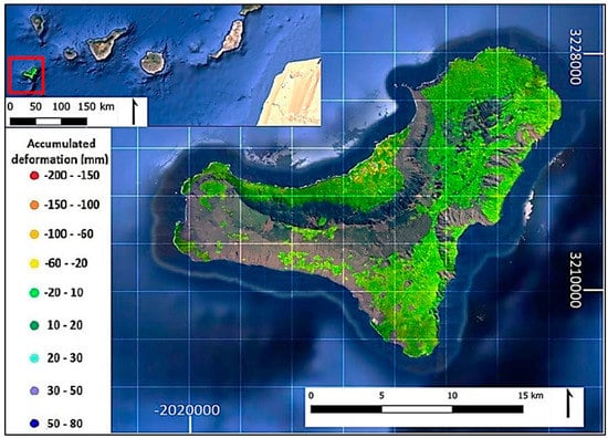 El Hierro is the south-westernmost island of the Canarias archipelago (Spain), located in the Atlantic Ocean off the coast of Africa. El Hierro Island is volcanic and sharply mountainous, hence it is a highly prone area to landslides and slope failures. Hence, the goal was to rapidly and semi-automatically generate a product to be easily exploited in the geohazard management by the Civil Protections Authorities and the Geological Surveys. The accumulated deformation map of El Hierro obtained with 2 × 10 multi-looked images using the DI approach is shown in