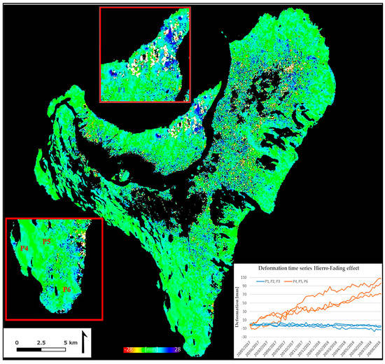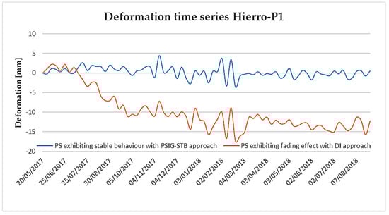 Figure 11), which had shown fading effects, while using only the multi-looked 6-day interferograms in the DI approach. This unaccountable behavior has been corrected using the PSIG-STB approach. This approach also has the same advantages of DI, i.e., easy to implement, but also provides robust results. However, the point density is sensibly lower. The accumulated deformation map resulted in a standard deviation (σ) of 0.95 mm, proving that most parts of the island displayed stable behavior in the PSIG-STB approach. Only the time series corresponding to 8657 points out of 57,821 points included in the dataset (i.e., the 15% of the points) have a total standard deviation higher than 1.9 mm. These statistics were considered satisfactory in the considered deformation monitoring.