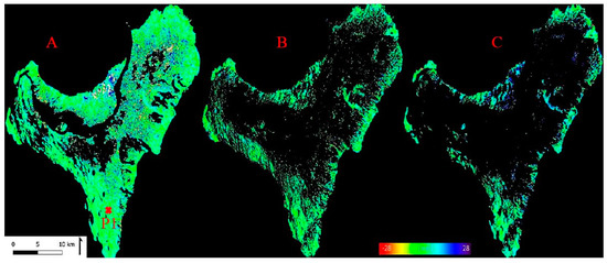 Figure 11 shows the results obtained with (A) the DI, (B) the PSIG-STB, and (C) the PSIG approaches, respectively. Many of such highly coherent “problematic” points are filtered out in the PSIG-STB method. Almost all fading effects were filtered or not selected as good points. It can be seen that most of the points in (B) are showing an absolute deformation velocity below 1 mm/yr. The corresponding time series should ideally contain only a negligible deformation.