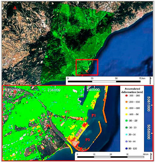 Figure 13B shows a magnified portion with the Barcelona port and El Prat airport. Port dikes show values of more than 10 cm of accumulated displacement from January 2017 to January 2019.