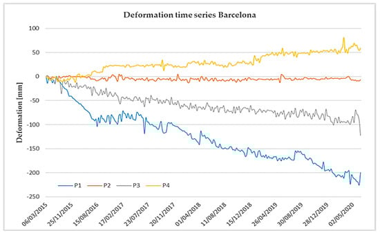 Figure 13, where different types of behaviors can be identified. In a relatively small area, there are deformations corresponding to an uplift (P4), probably related to underground water recovery. Some of the uplift detected in areas along the shores of the Llobregat River is mainly caused by sedimentation. The displacement in the whole frame ranged from −300 mm/year to 150 mm/year. Then, there are PSs that are moving away from the satellite revealing a significant amount of sinking or subsidence, such as the points in the port and some structures in the urban area (P1 and P3): settlements in the dyke (P3) or in the harbor (P1). Then, there are stable points where all the observations are consistent, with less or no outlier candidates (e.g., P2), which helps us to assess the quality of the deformation time series.