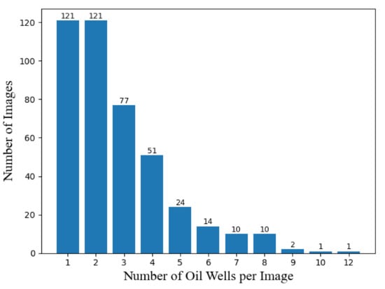 We constructed a dataset named Northeast Petroleum University–Oil Well Object Detection V1.0 (NEPU-OWOD V1.0) of oil wells that contains the geographical coordinates and labels for each of the oil wells. Our selected research region for this work is in Daqing, China. Daqing is located in North China and is known as “Oil Capital of China”. Our dataset covers an area of 369 square kilometers as seen in Figure 4. The sample images in our dataset are 768 × 768 pixels, 768 × 1024 pixels and 1024 × 1024 pixels. Our dataset contains 432 images which contain 1192 oil wells from Google Earth Images with a very high resolution of 0.41 m per pixel. Figure 5 shows the distribution of the number of oil wells per image. It is noted that in most of the images, there are only 1 or 2 oil wells. In order to increase the diversity of the dataset, we included the images with the different backgrounds and various orientations of the oil wells (see Figure 6).